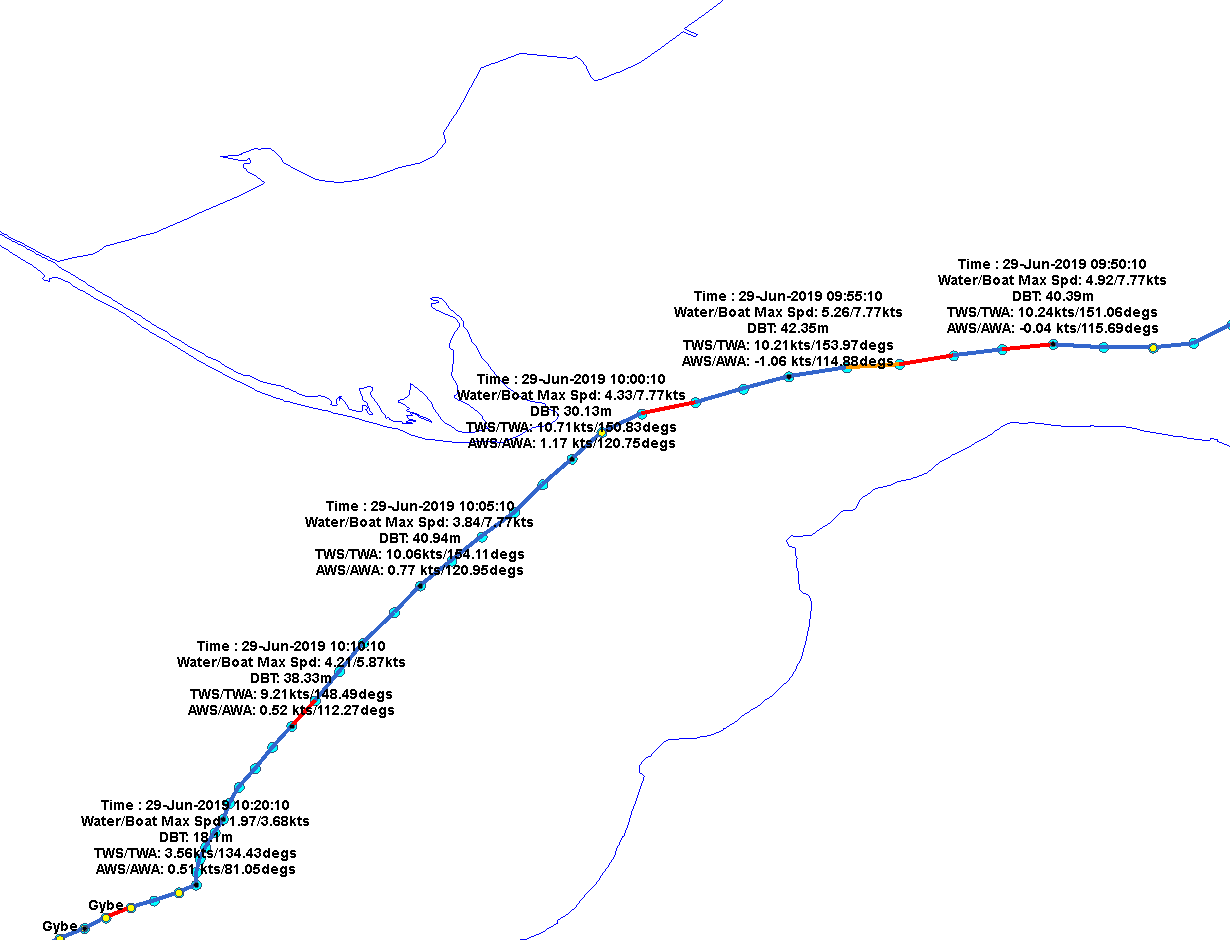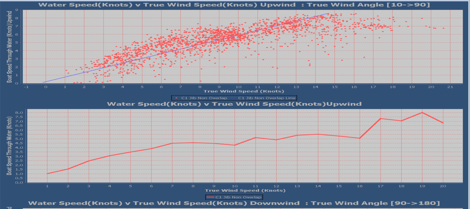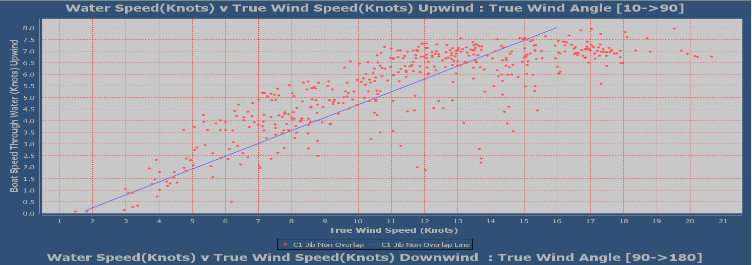 The second lower line at the boat level plots the average boat speed for each given wind speed. So if we have 30 sample periods for a given wind speed the value displayed is the average of those 30 samples.
