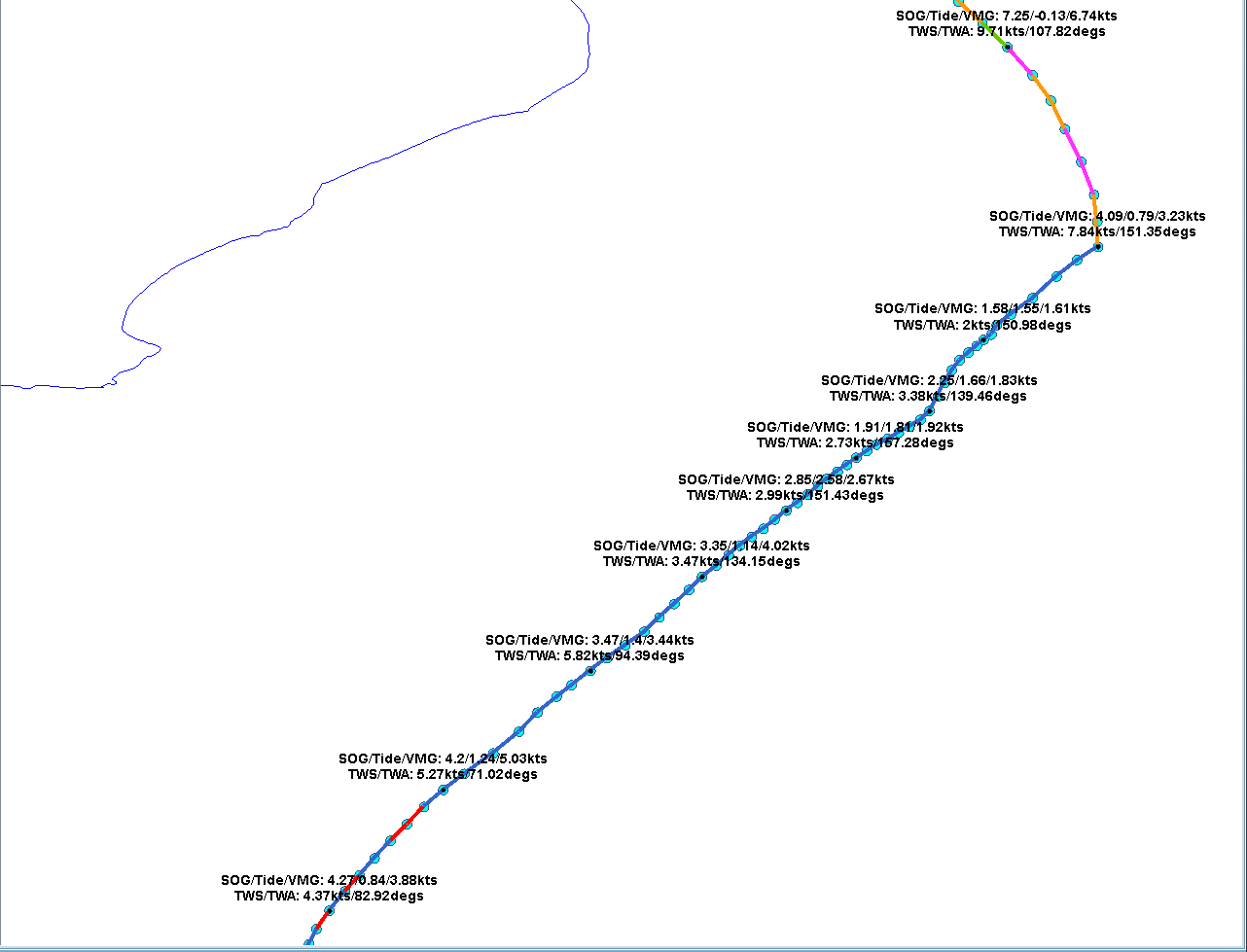 So the pink segments of the Rockit track line, on the left, is us hitting the line flat out. Pink implies this is a personal best for the boat in the given true wind angle/true wind speed combination.