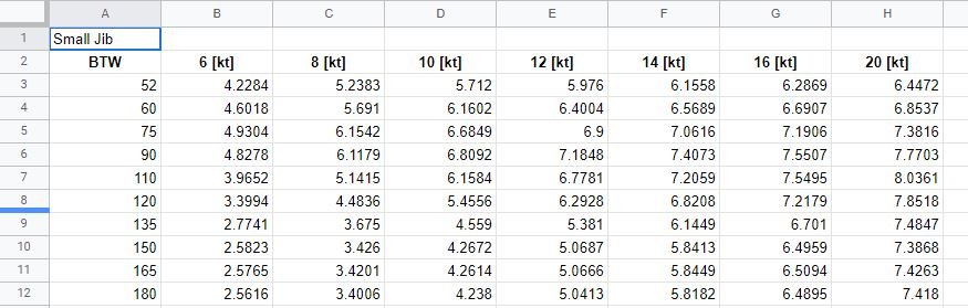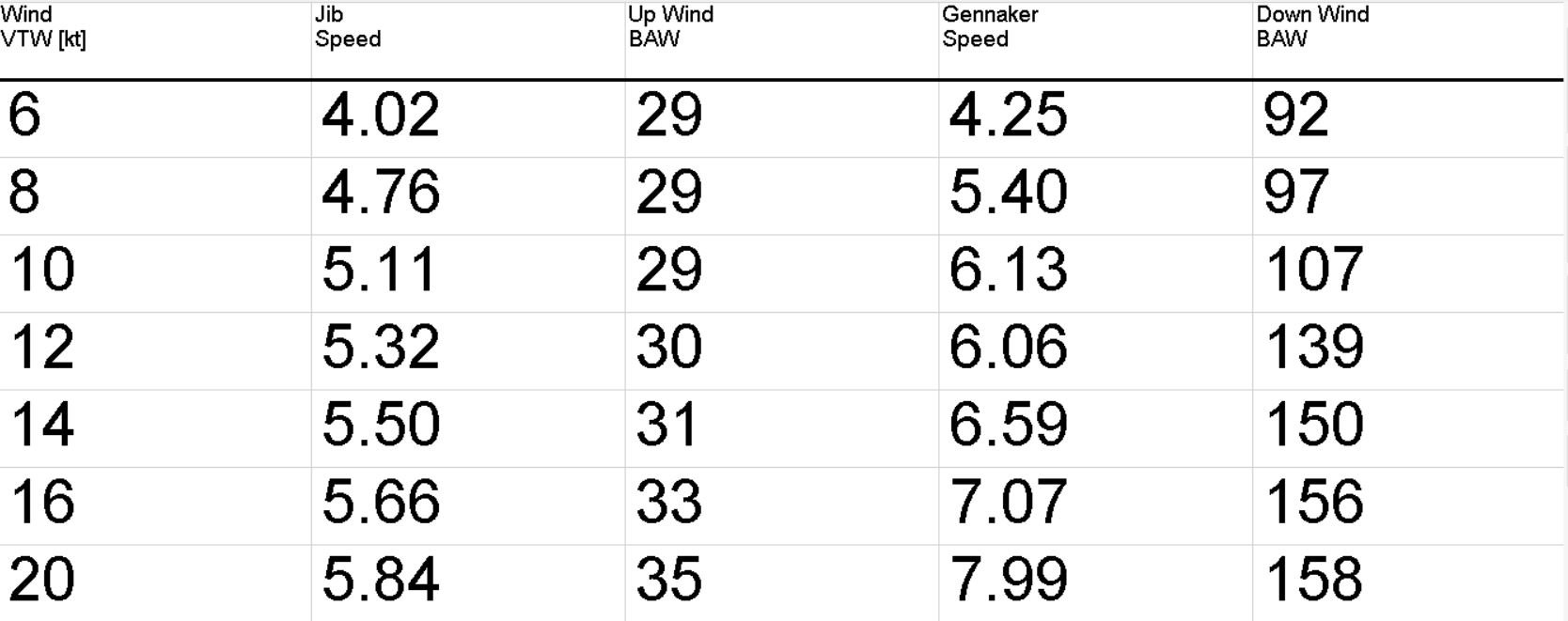 So you have a table of boat speeds to aim for in a given set of sailing conditions. This table again is from the Sailfish VPP.