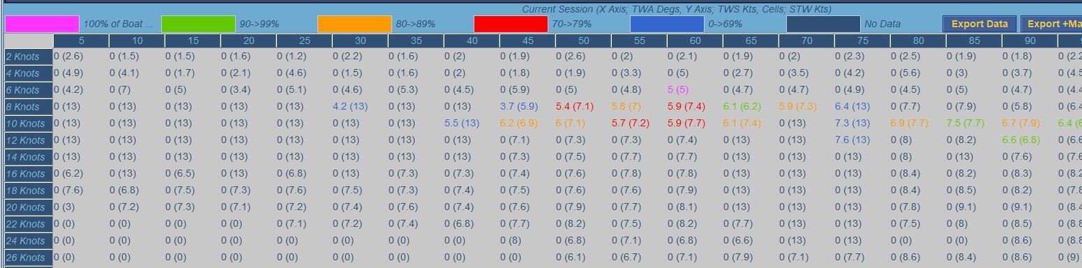 Bringing it full circle we can see how the boats performance overall relates to the original VPP prediction. the screen shot below shows the Polar table for