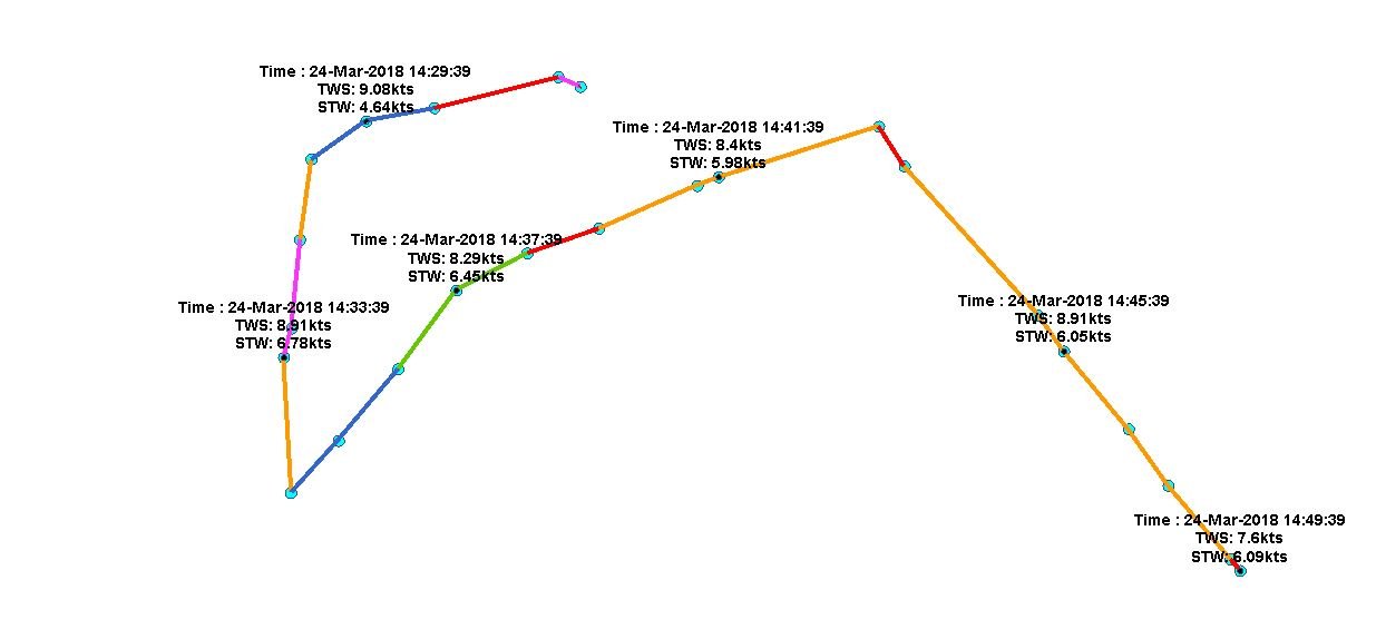 So for every minute we knew where the boat was and the average STW. We picked average STW as this seemed the best guide to how effectively the boat was harnessing the energy of the wind and turning it into forward motion. Speed over ground (SOG) didn’t (and still doesn’t) really tell us anything useful in this context. There are too many other factors at play; leeway, tide etc for it to be a good benchmark.