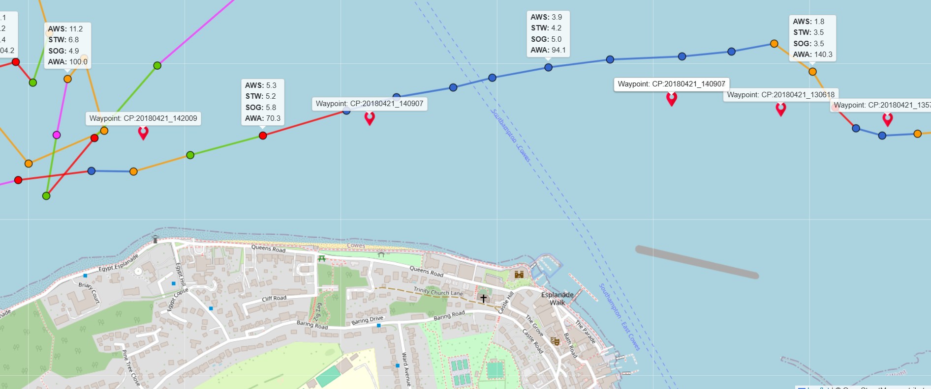 With the big sail up we get moving again and the tide starts to turn with us. You can see the Speed Through the Water starting to match then be overtaken by the Speed Over Ground.