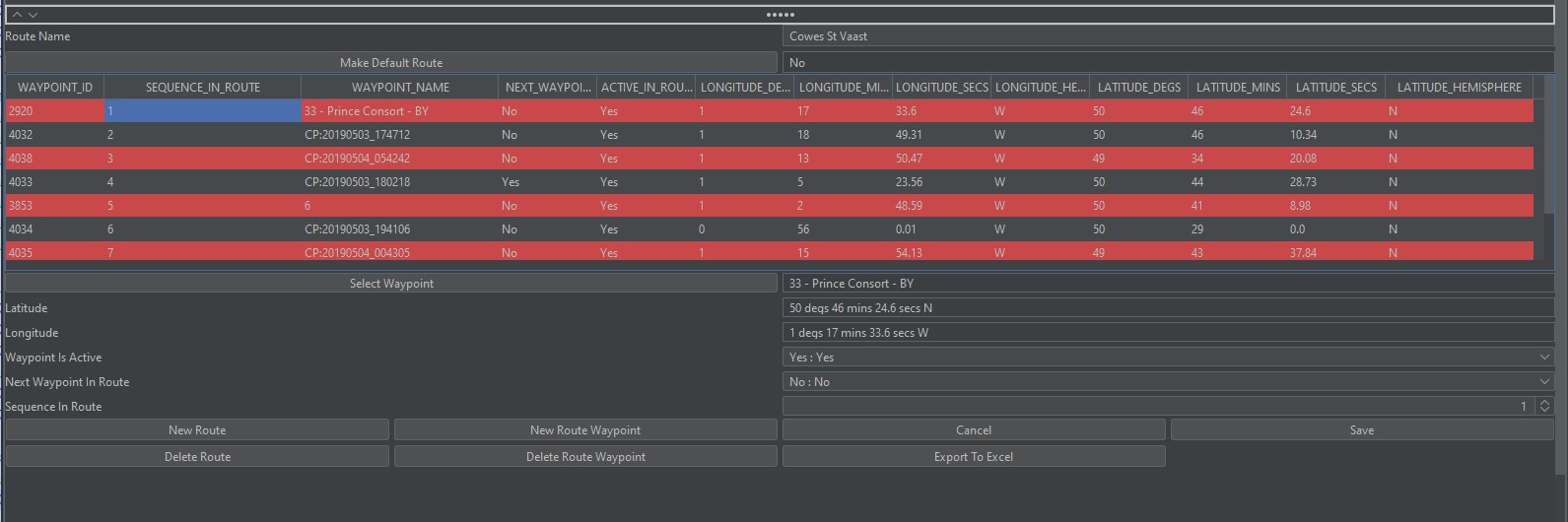 2. When a route is clicked upon in the top list the related Route Waypoints for the route will appear in the bottom half of the screen,