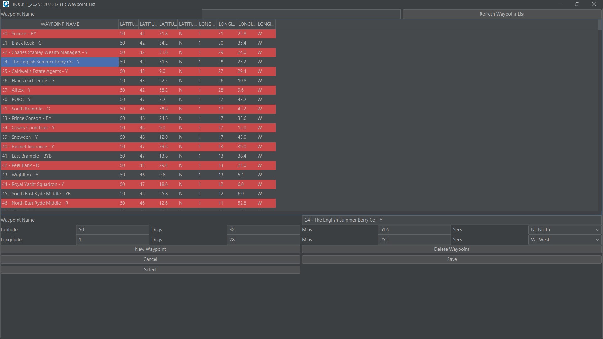 • You can use the filter list at the top of the screen to narrow down the Waypoints list returned. For instance if you are looking for the Fastnet Insurance racing mark (40 – Fastnet Insurance – Y) enter 40 – F in the filter box and press Refresh Waypoint List. That would just display Waypoint starting with 40 – F; effectively 1 record in our test data.
