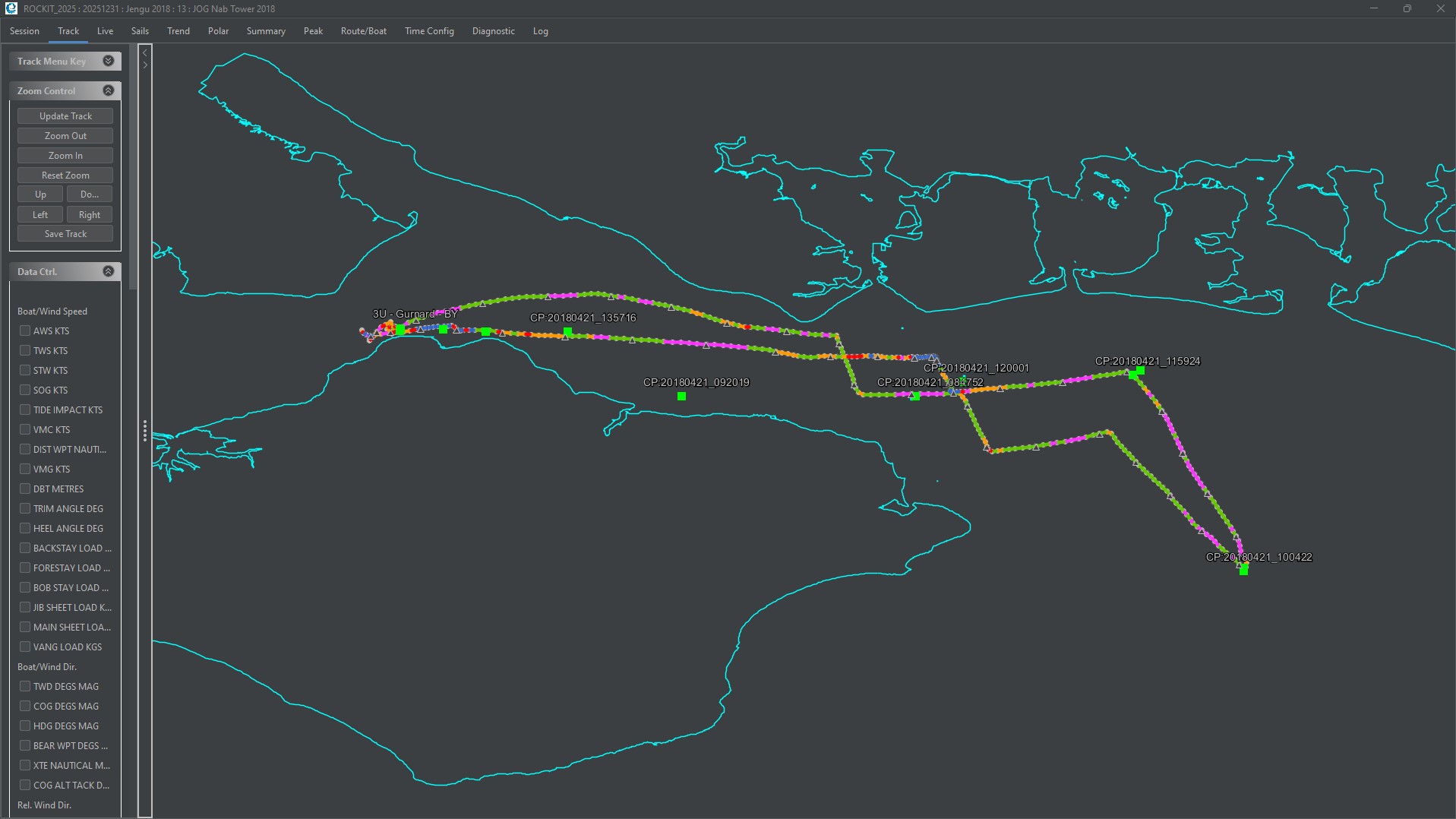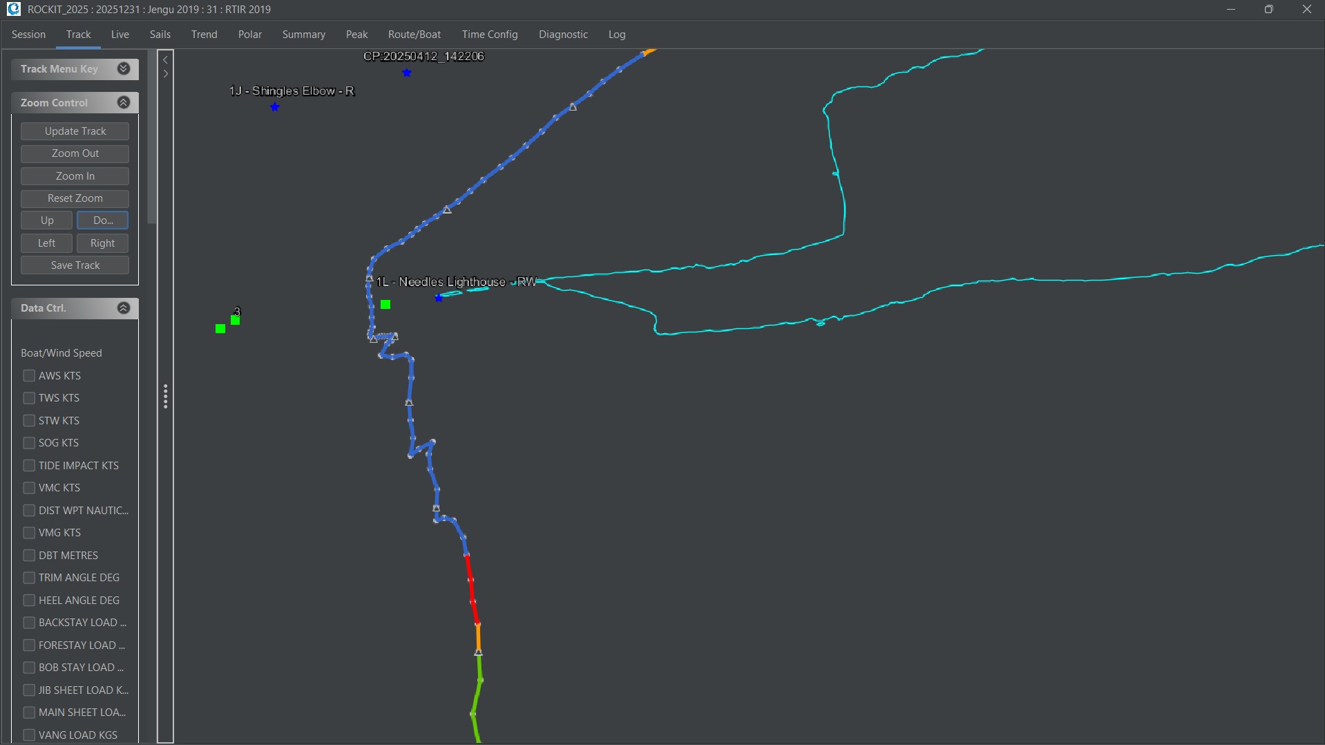 Racing offshore we will put marks into the chart plotter to give the helm a course to steer (and provide answers to the crews “are we nearly there yet” questions). These will be picked up in the by Rockit Analytics and plotted on the Track Panel.