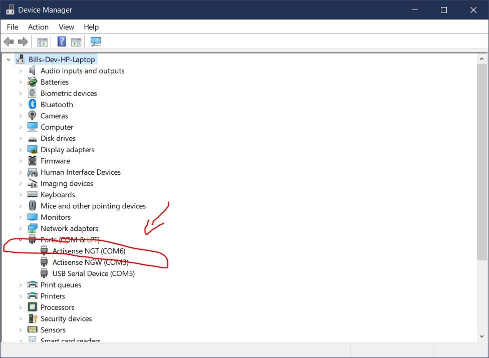 Expand the Ports(COM & LPT) node in the tree control. Any Actisense or Yacht Devices USB devices attached to your computer should be listed there along with the port number. For example COM6.