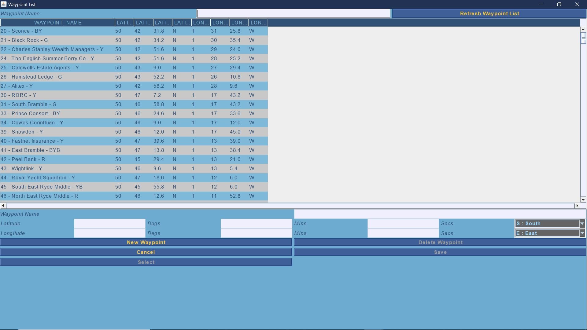You can use the filter list at the top of the screen to narrow down the Waypoints list returned. For instance if you are looking for the Fastnet Insurance racing mark (40 – Fastnet Insurance – Y) enter 40 – F in the filter box and press Refresh Waypoint List. That would just display Waypoint starting with 40 – F; effectively 1 record in our test data.