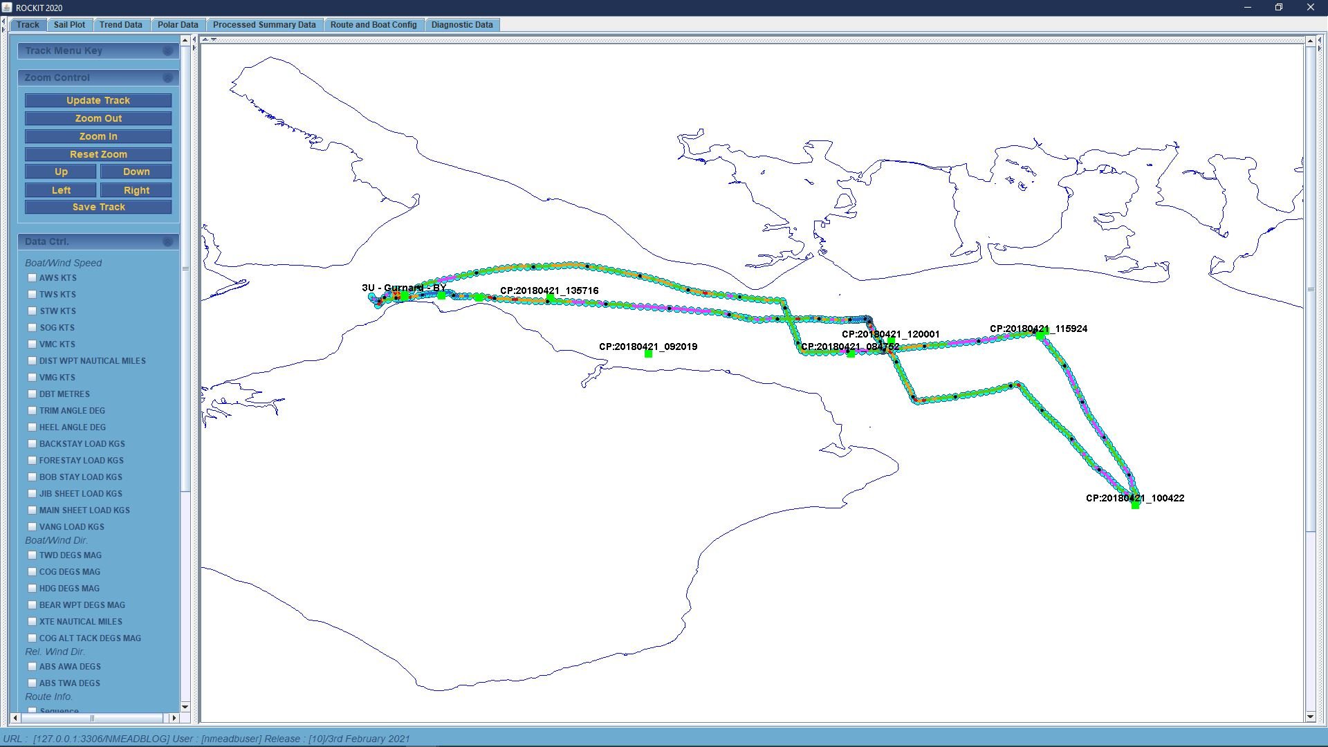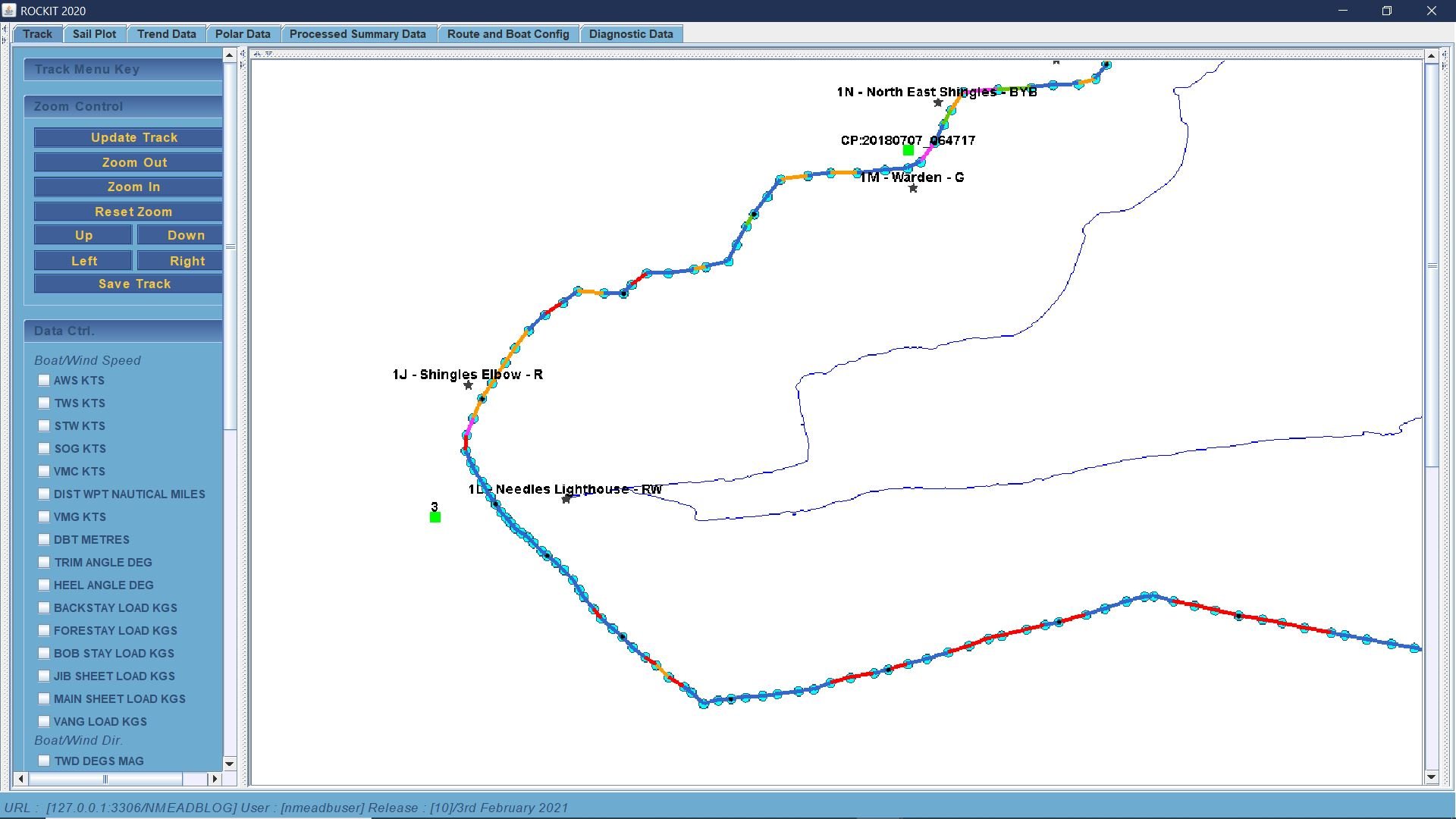 Racing offshore we will put marks into the chart plotter to give the helm a course to steer (and provide answers to the crews “are we nearly there yet” questions). These will be picked up in the by Rockit within the RMB messages and plotted on the Track Panel.