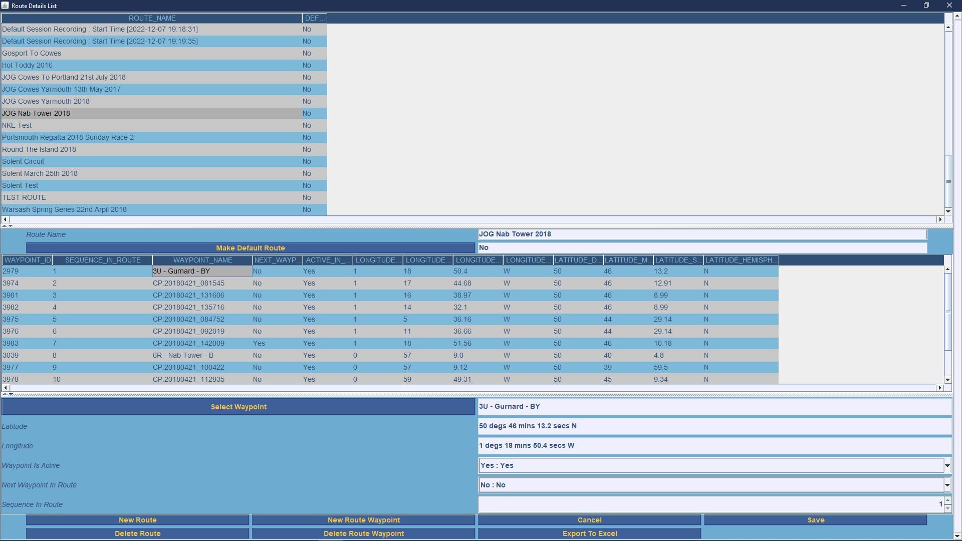 - When a route is clicked upon in the top list the related Route Waypoints for the route will appear in the bottom half of the screen,