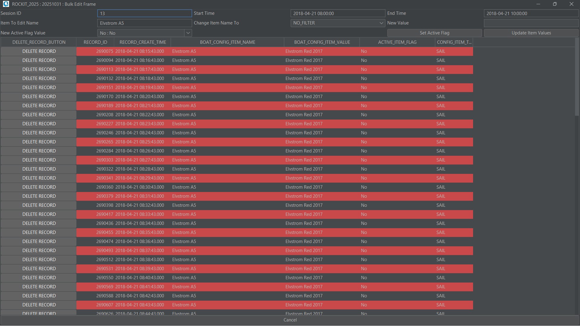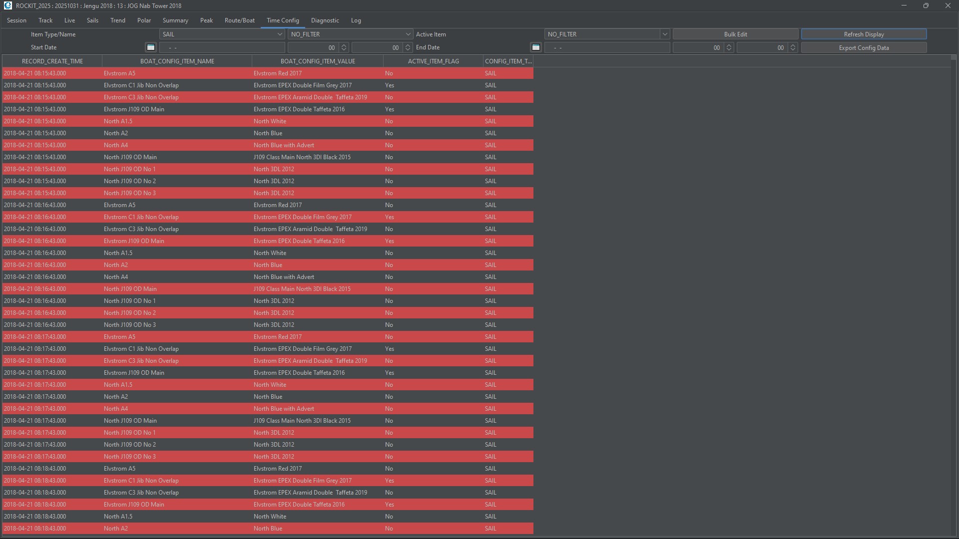 This feature is useful for recording things like the current Helmsman. So the config Item Value would go from “Bill” to “John” and that would be reflected in the recorded config item data. Rockit uses this Boat Config Item data as the basis of the information it records for each Sample Timeslot. It stores a copy of the Boat Config Items state at the point in time of the Sample Period. Retrospectively editing the Boat Config Item information stored against the Sample Periods is possible as part of a bulk edit and will be covered later in this article.