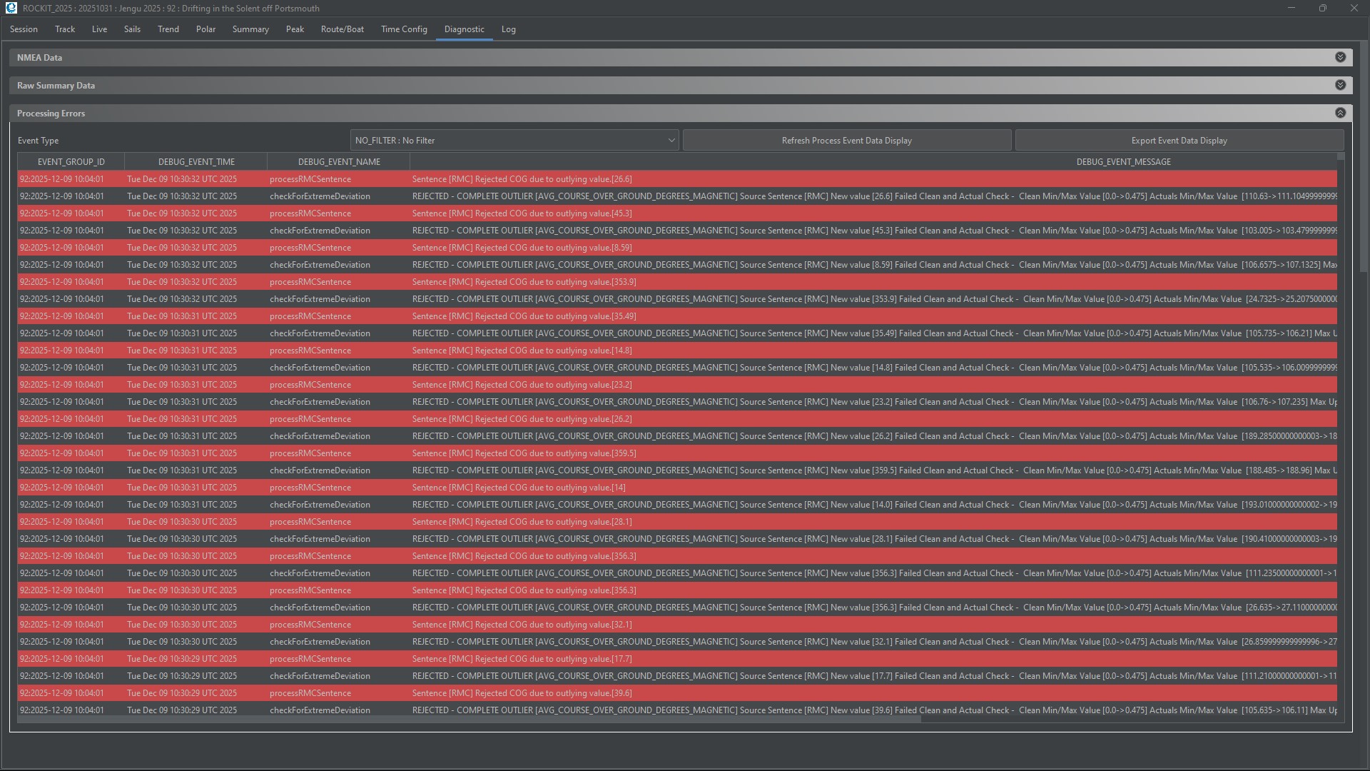 Rockits NMEA Data table contains basic information about the sentence and a set of fields to represent the data points in the messages, The aim with this table was to collect enough information to drive the calculation process that drives the summary and polar data creation. In theory an NMEA 0183 message can contain up to 50 data points so we should have 50 data columns in the table. In reality we found that the message types we were collecting only required 40 columns maximum. NMEA 2000 messages are collected in a similar way with the messages being broken out into their sub-components and stored in individual fields.