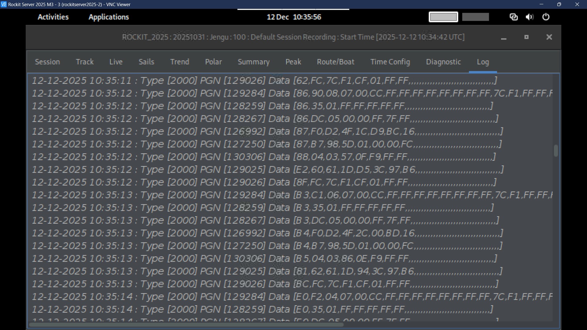 The final tab will display logging information as data is collected. In this case running on the Rockit Server version of the software viewed through VNC viewer you can see the NMEA 2000 messages that the server is receiving. They will be extracted and stored in the NMEA data table.