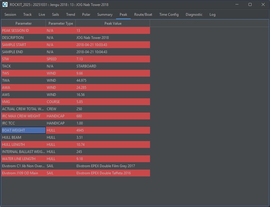 The first 23 data points (rows) are fixed and generated from the NMEA data collected by the Data Collection process. The remaining data points are extracted from the Boat Configuration settings and reflect the configuration settings at that point in time. The configuration settings are user configurable. In the example above “Actual Crew Total Weight” onwards is boat configuration data. Changes to the boat’s configuration made mid-session will be reflected on this table.