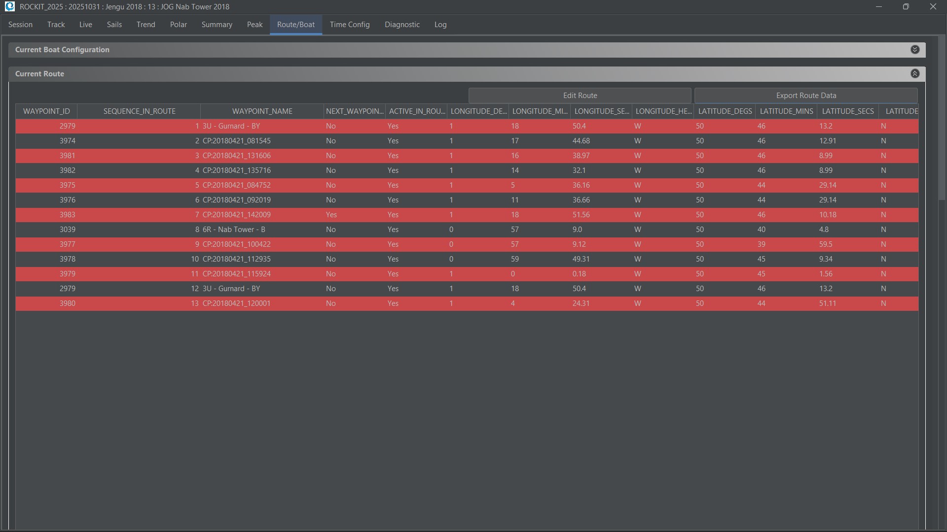 This shows the route that the boat is set to follow and its current next waypoint. As with the Boat Config Items you can edit the active status of a Route Waypoint – you can have a Waypoint in the route sequence that is inactive, for instance, because you decided to by pass it. You can also edit which is the next Waypoint. Stepping off the record will save the change to the database.
