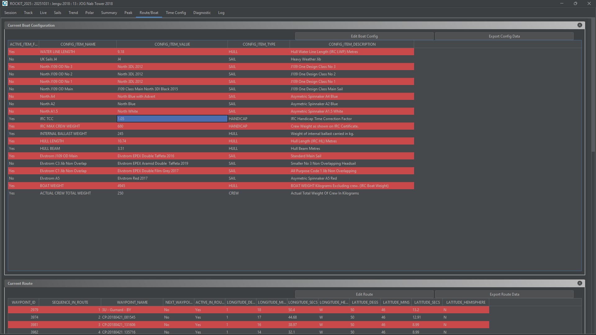 Sails are defined as Boat Config Items. So our test J109 has a set of 7 sails defined; A1.5, A2, A5, C1, C3 etc.