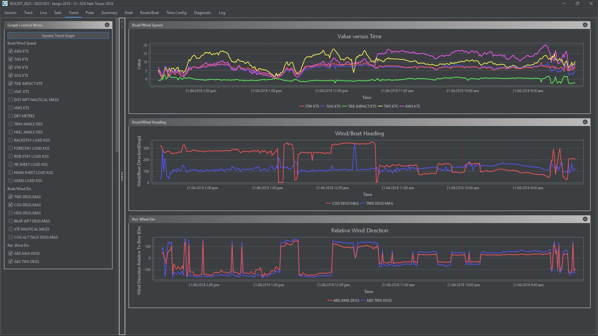 | Trend Data | This allows the summary data to be plotted in time series form. You can see how the wind/boat performance indicators evolve over the session. |