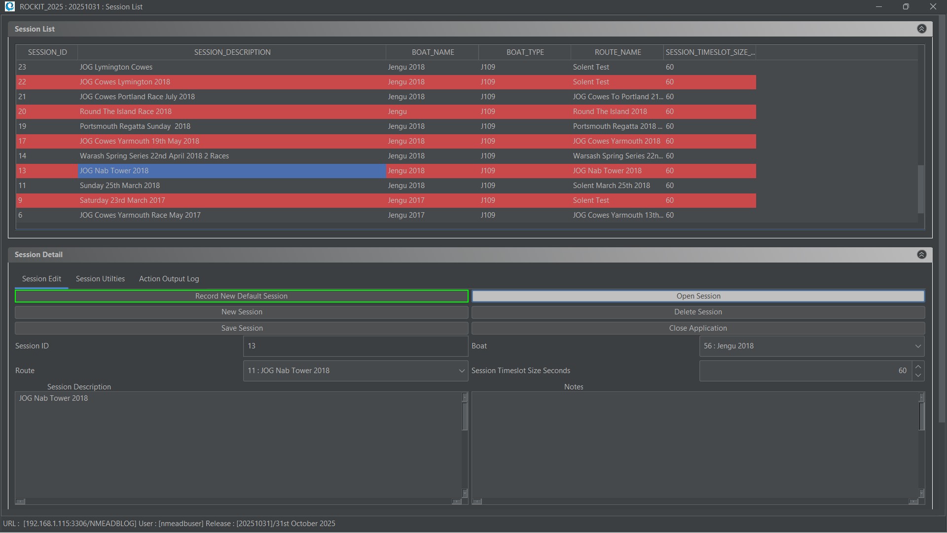 This is the screen that you get when you open Rockit on a Laptop or Rockit Server Device. It gives you a list of the sessions that you have already recorded and the ability to edit the descriptive information about those recording sessions. Clicking a row in the list of recorded sessions brings the data values into the form in the bottom half of the screen.