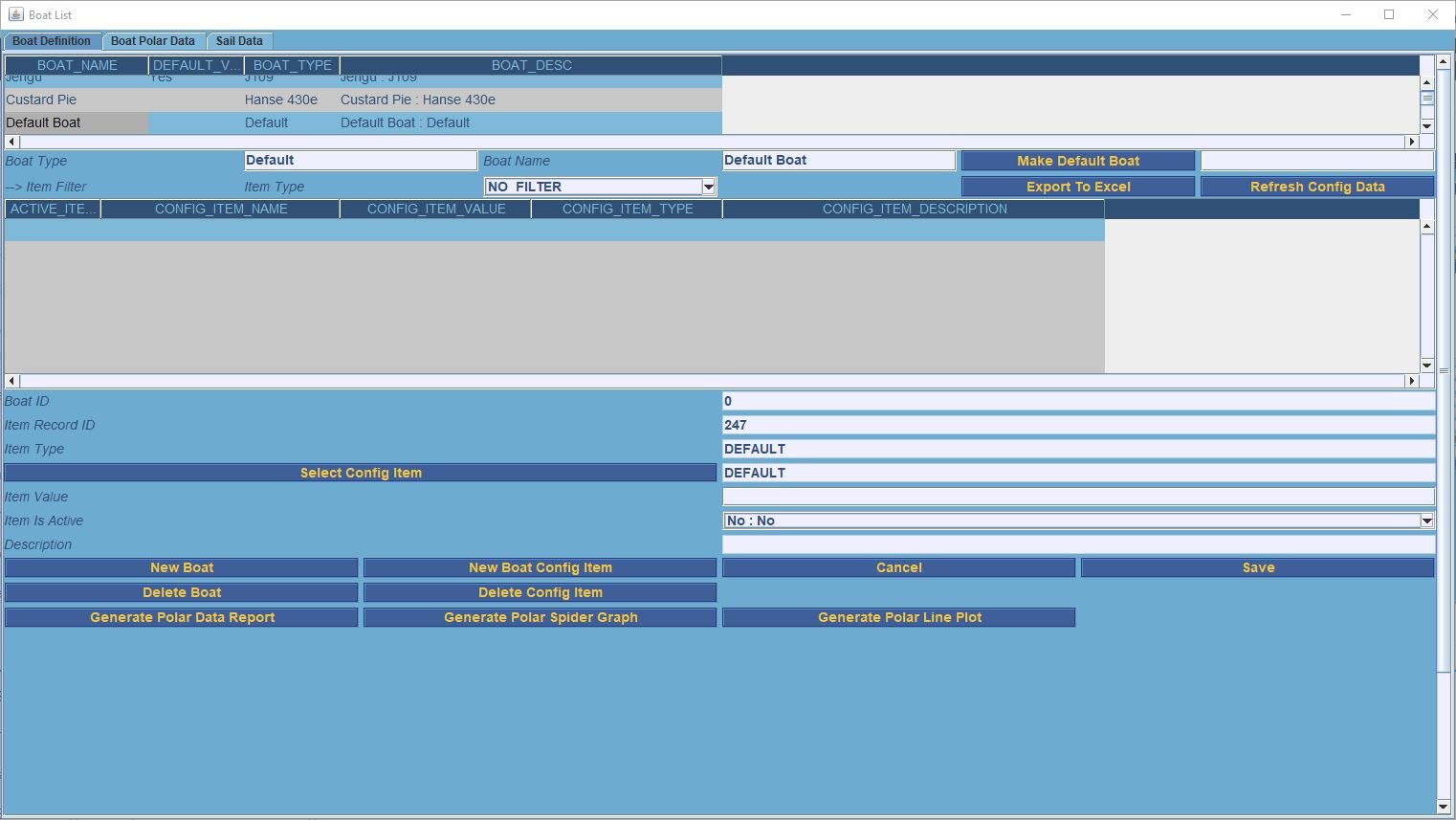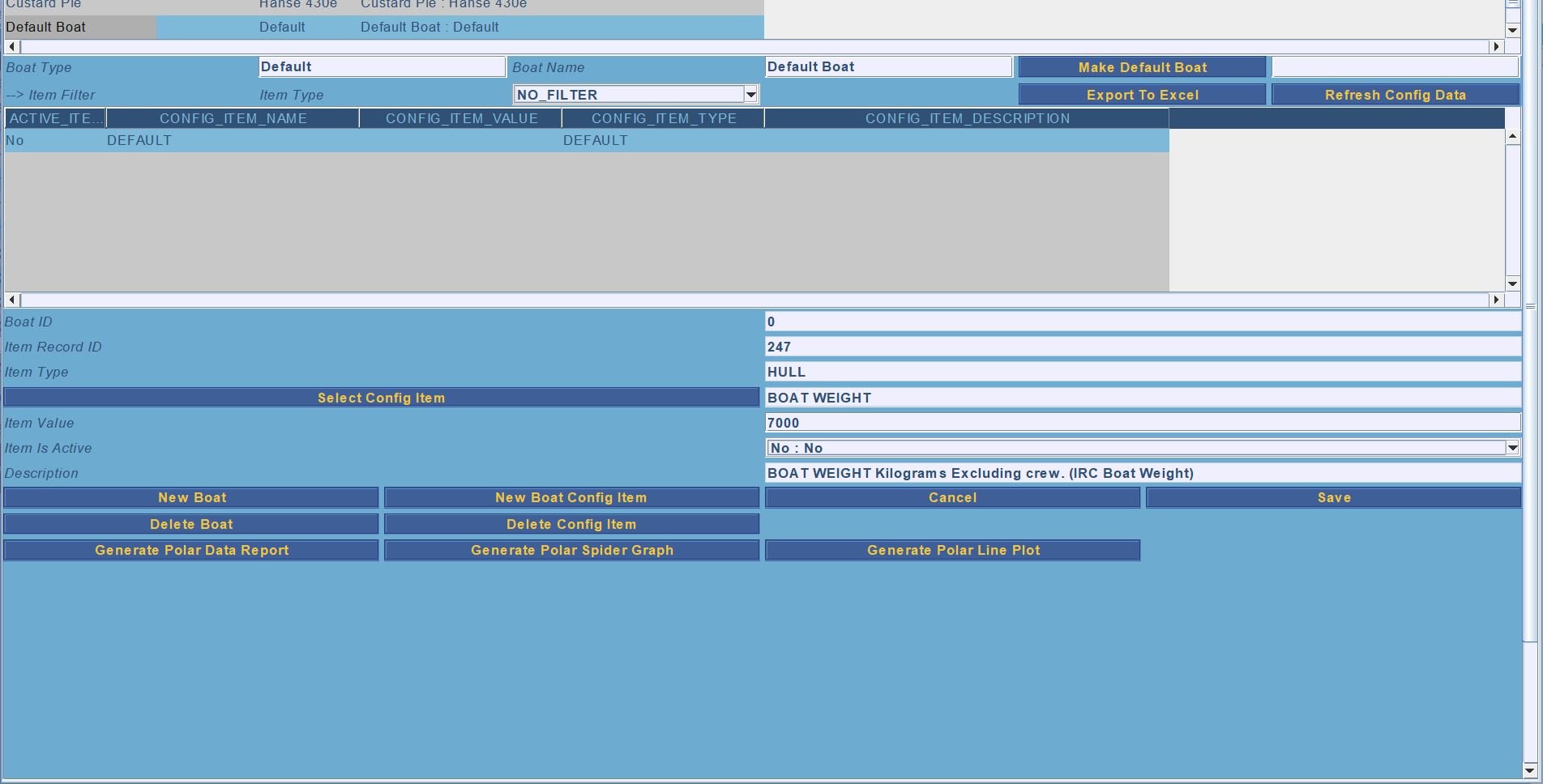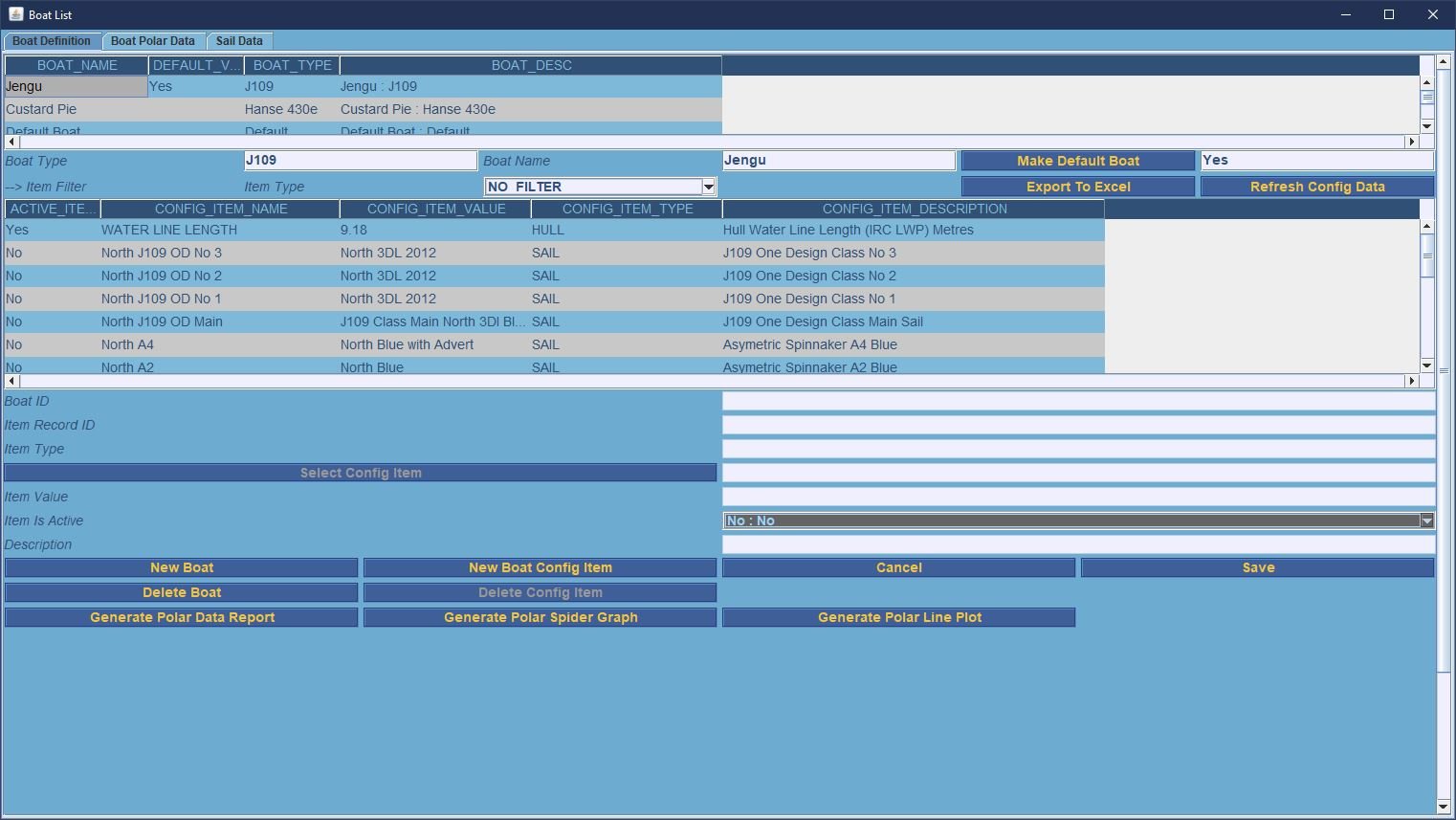 We can also select whether the item type is going to be active as a default for the Boat. We can also turn Config Items on or off as part of the Data Collection process once the recording session has started. Generally Sails are set to be inactive and turn active during the recording session.