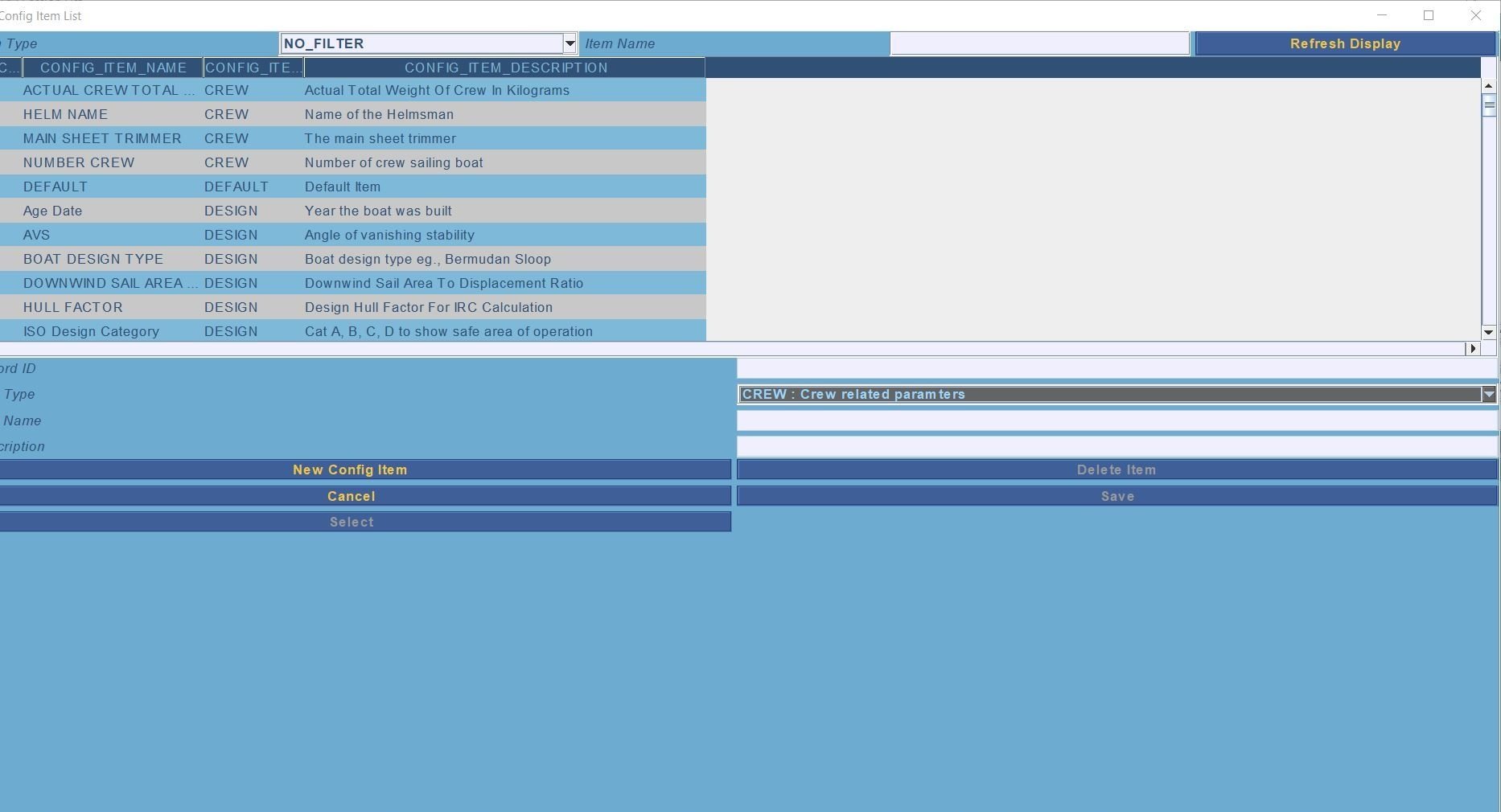 You can also filter the items in the list by Type. Click the Type drop list to select the Type you are interested in then press the Refresh Display button to filter the list. So Click ‘Sails’ and press refresh list to display only the possible sails Config Items.