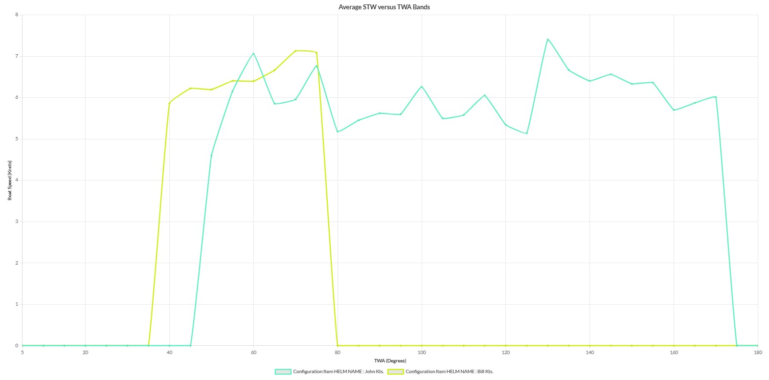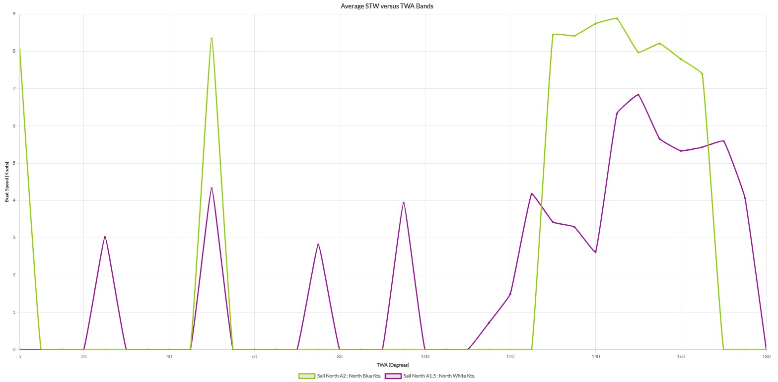 Plots each sail as a series; it divides the TWS data points by TWA band (as with the Polar Data) and plots the data.
