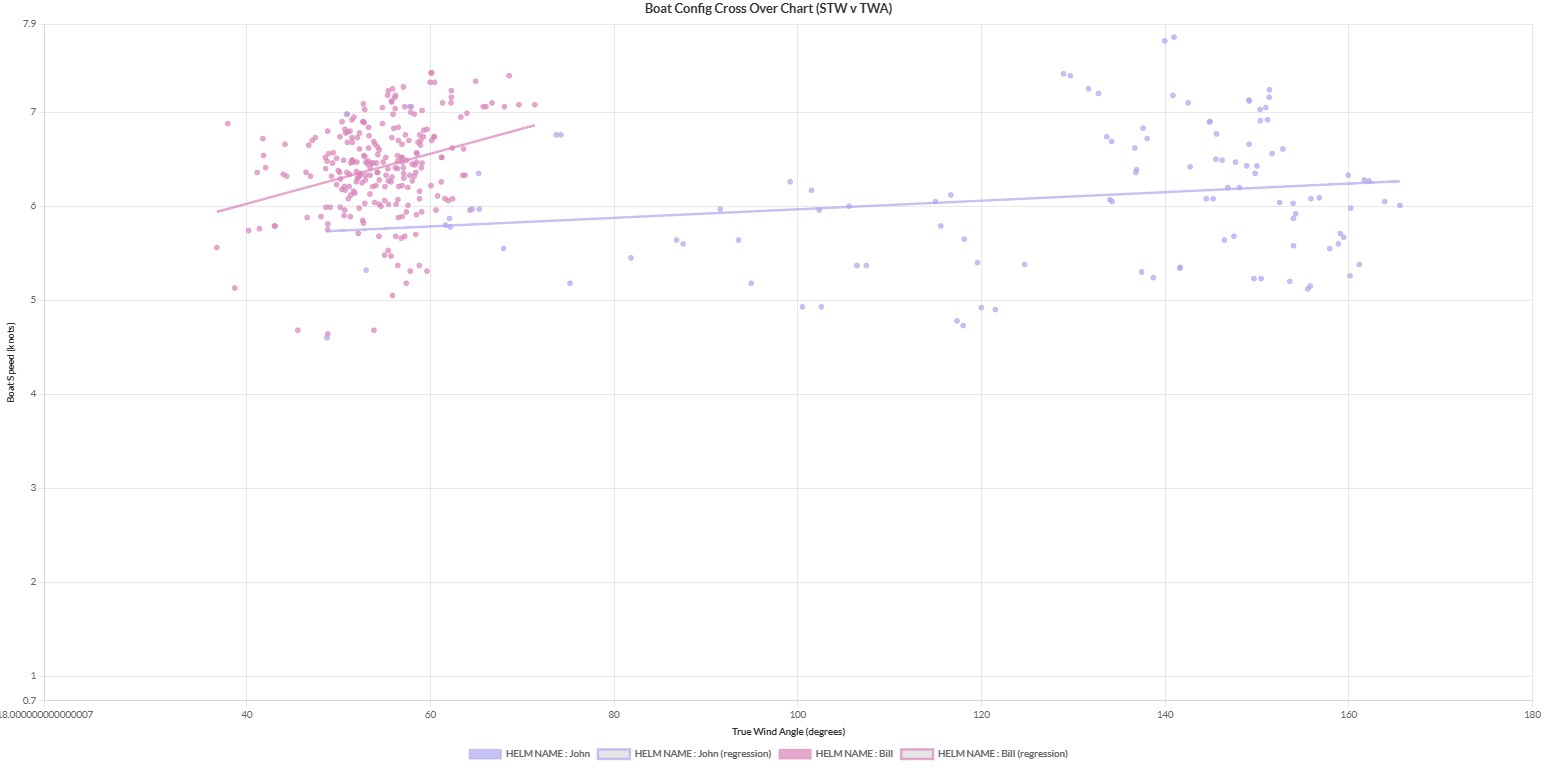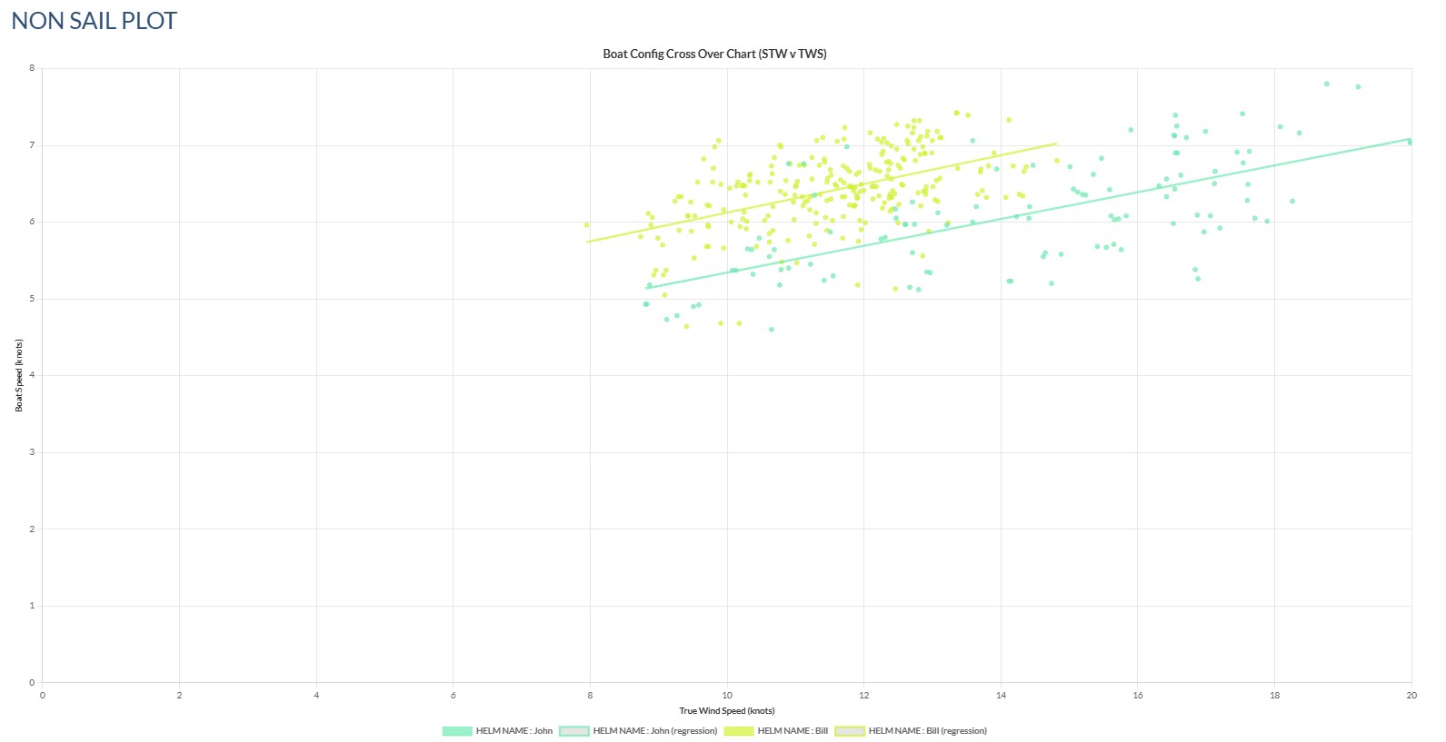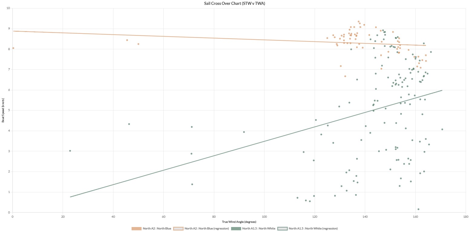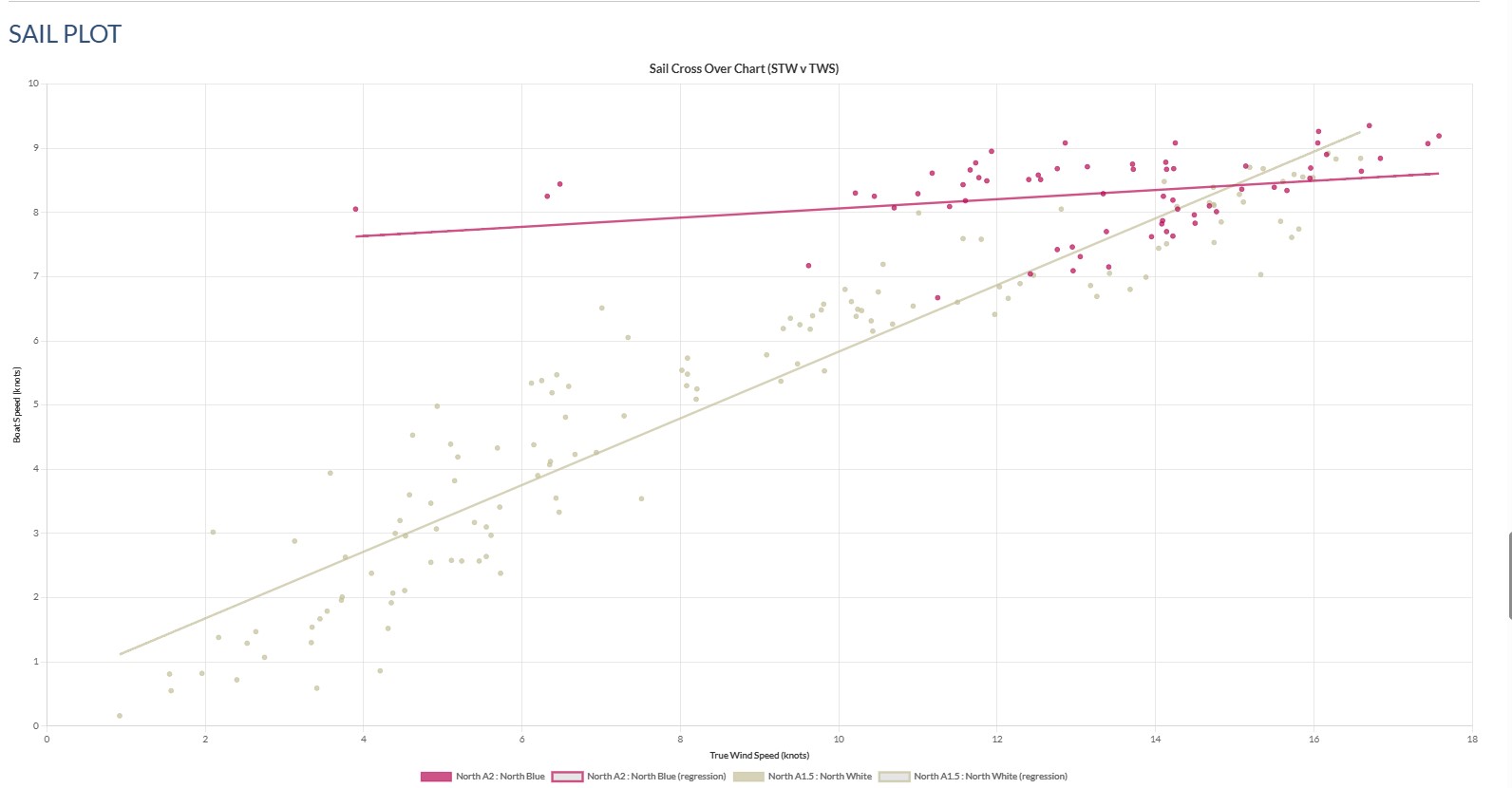 Plots each sail as a series with the STW and TWS on the axis.  The data points for each series are plotted as a rough cloud of points and a linear regression line plotted.
