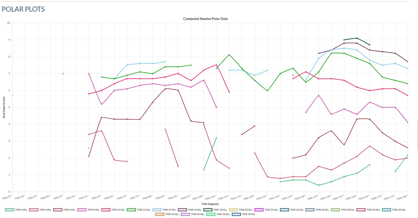 This graph plots the values from the table for a Session onto a standard line chart. The functionality is identical to the line charts; you can turn series on or off and zoom in or out. The graphs only plot the populated values. So if there is a TWS/TWA combination that is not present in the session nothing, including a zero value, will be displayed.