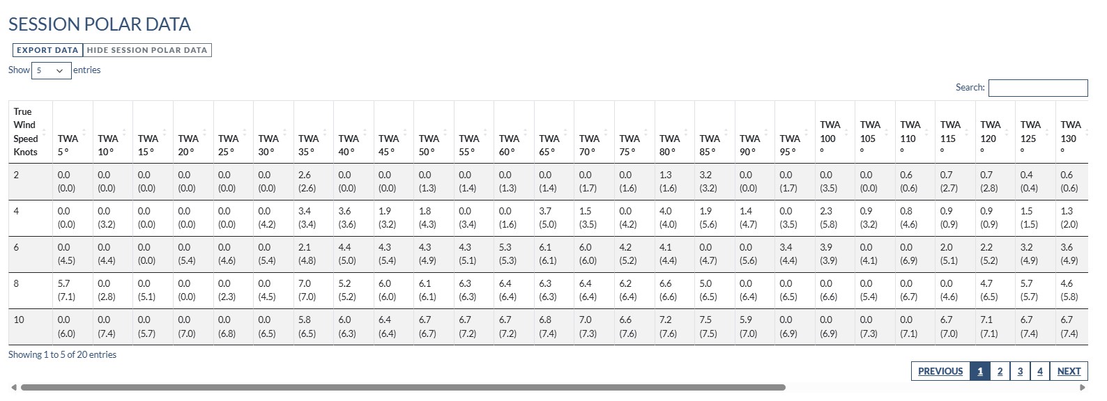 Polar value a based on the average for a timeslot. The value in each cell in the table represents the best average performance in the session for that given True Wind Speed and Angle. The number in brackets is the boats best performance for that True Wind Speed and True Wind Angle.