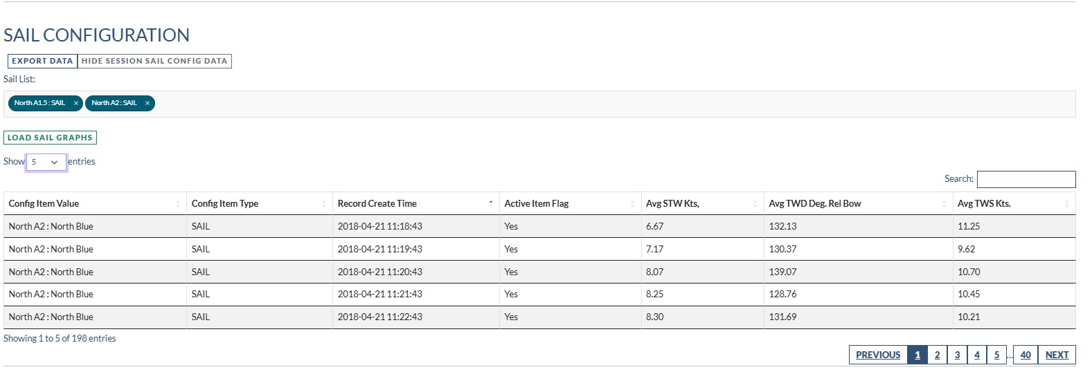 The sail configuration table takes the Time Boat Configuration information uploaded from the Rockit Software and plots it on a series of scatter charts.  Which sails are active in which timeslot can be managed through the Rockit software. Follow the instructions below to find out how to manage that information.
